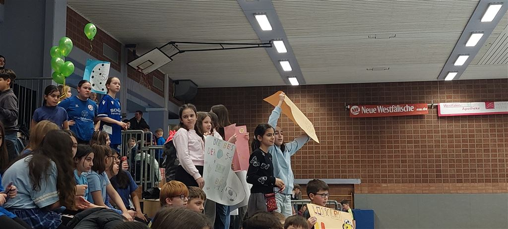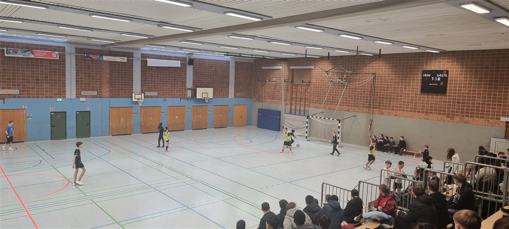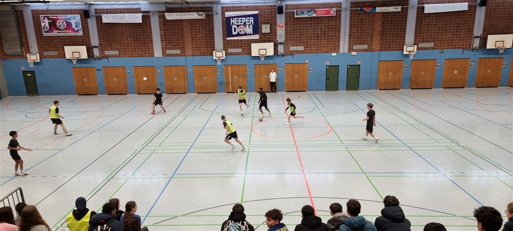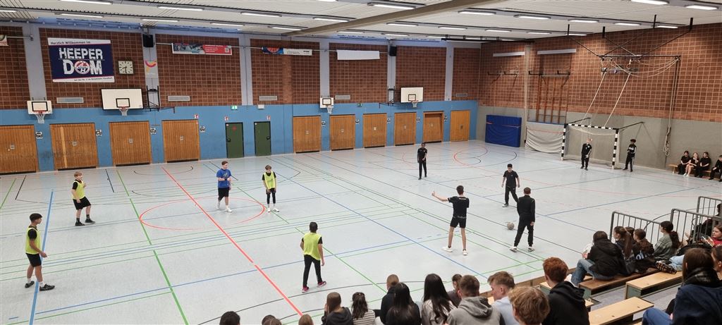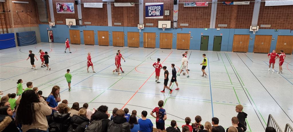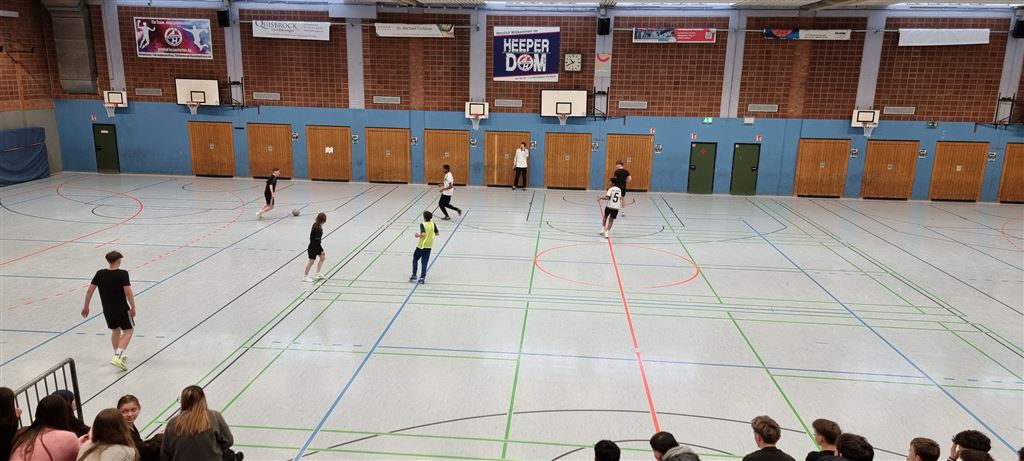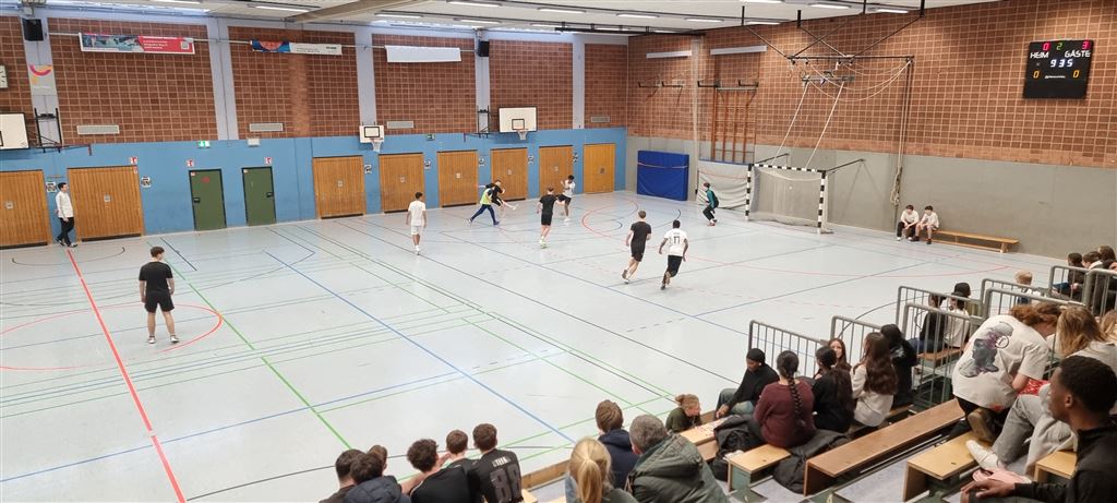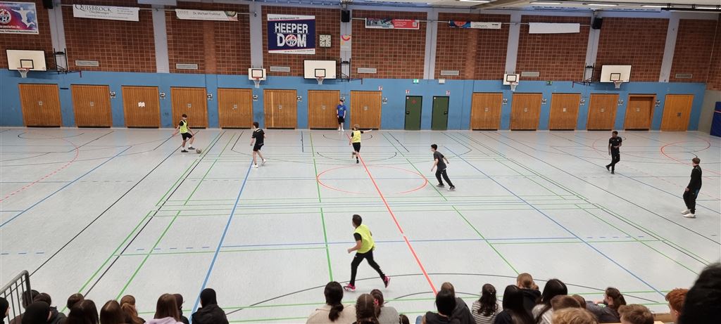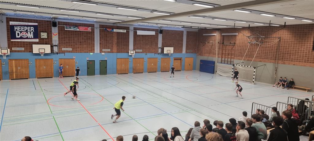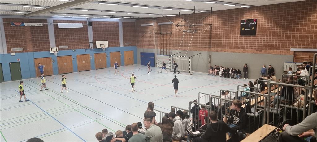 Heute fand in der Sporthalle der Realschule Heepen wieder der erste Tag unseres großen Fußballturniers statt. Wie üblich traten gleich morgens die 9er und 10er gegeneinander an. Es gab wieder Hallenfußball auf höchstem Niveau zu sehen. Im Endspiel der Gruppe trafen die 9a und die 10b aufeinander. Trotz bis dahin höchst erfolgreichem Turnierverlauf musste sich die 10b nach einem hervorragenden Endspiel der überlegenen 9a geschlagen geben. Wir gratulieren zum ersten und zweiten Platz.