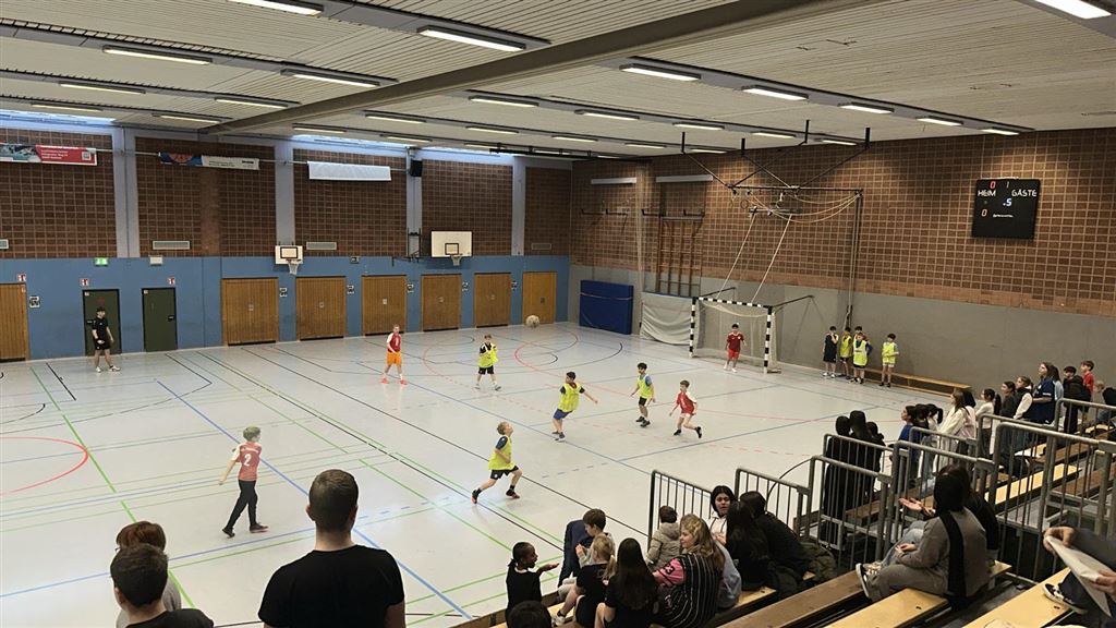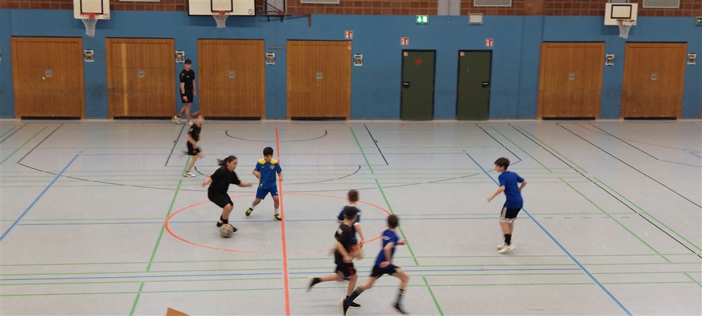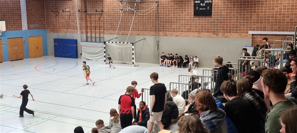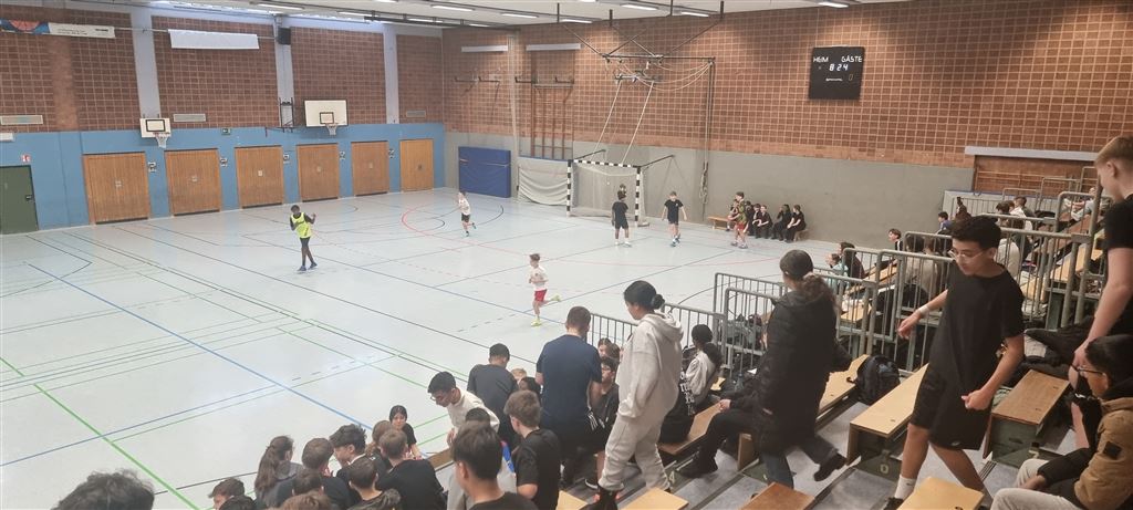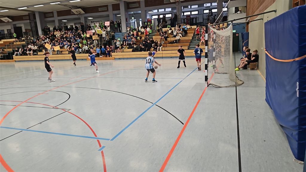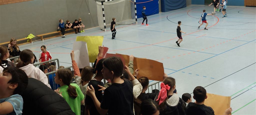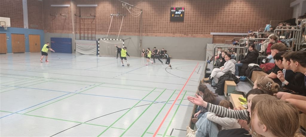 Im Anschluss waren unsere 5er und 6er an der Reihe. In der zweiten Hälfte des Vormittags und im Anschluss an die Mittagspause zeigten sie, was in ihnen steckt. Bei bester Stimmung forderte das begeisterte Publikum seine Helden mit Hilfe von Plakaten und Sprechchören zu Höchstleistungen auf. Leider mussten sich die spielstarken 5er den 6ern geschlagen geben, die durch ihre körperliche Präsenz einfach im Vorteil waren. Letztlich gewann am Nachmittag die 6c in einem spannenden Finale gegen die 6a. Wir gratulieren unseren Nachwuchskickern.